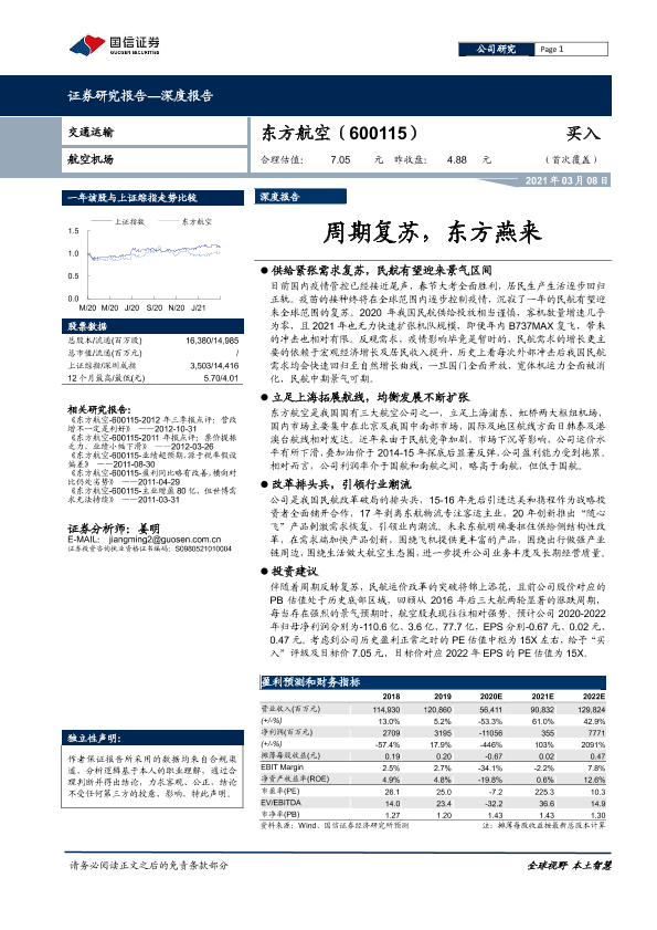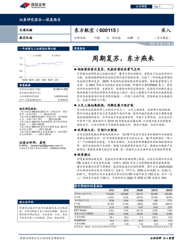 东方航空 周期性行业 民航需求 航空业复苏 证券分析