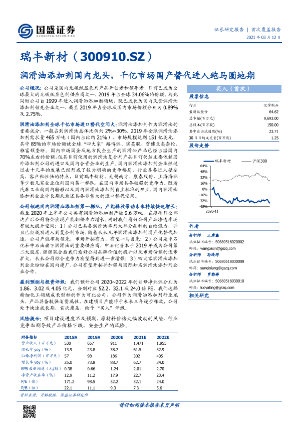 【国盛证券】【20210312】瑞丰新材(300910.SZ):润滑油添加剂国内龙头,千亿市场国产替代进入跑马圈地期-20页