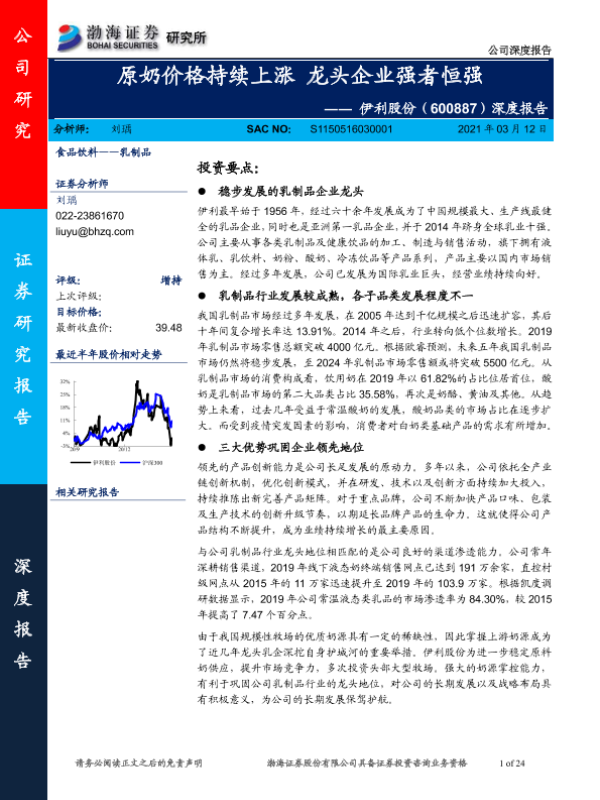 【渤海证券】【20210312】20210312-渤海证券-伊利股份-600887.SH-深度报告:原奶价格持续上涨 龙头企业强者恒强-24页