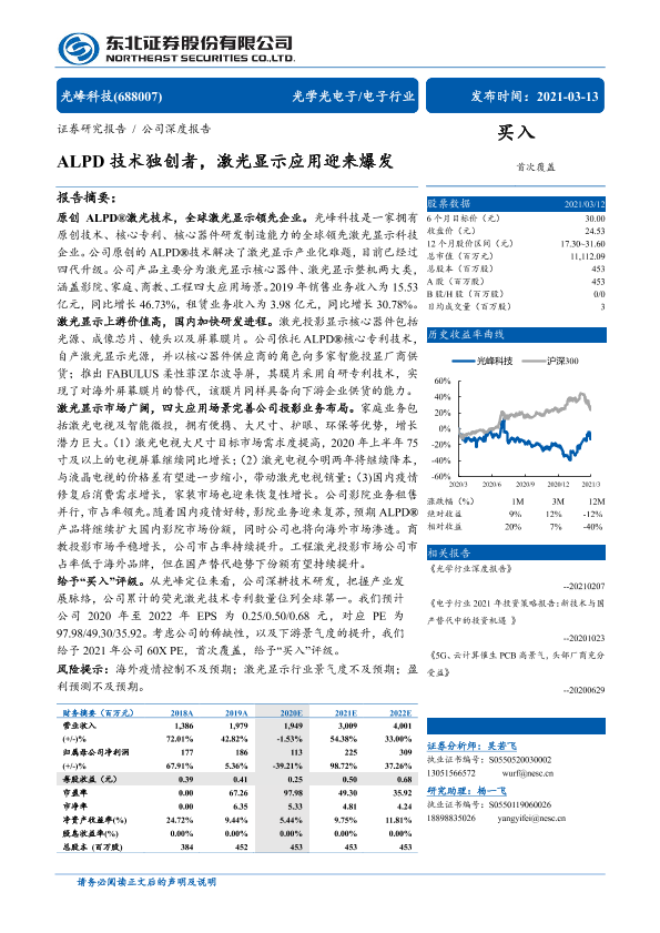 ALPD技术 买入评级 光峰科技 激光显示 证券分析
