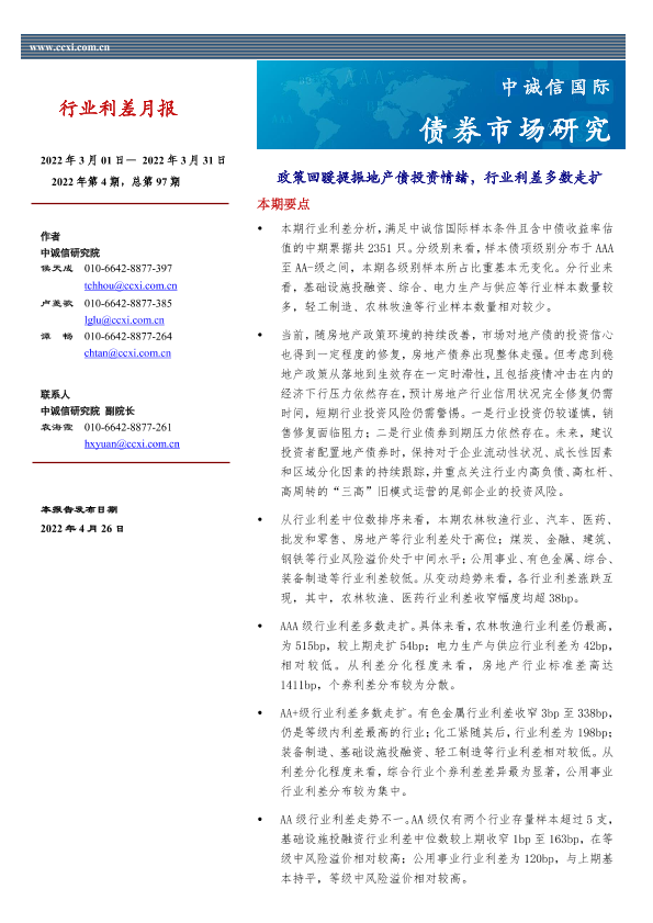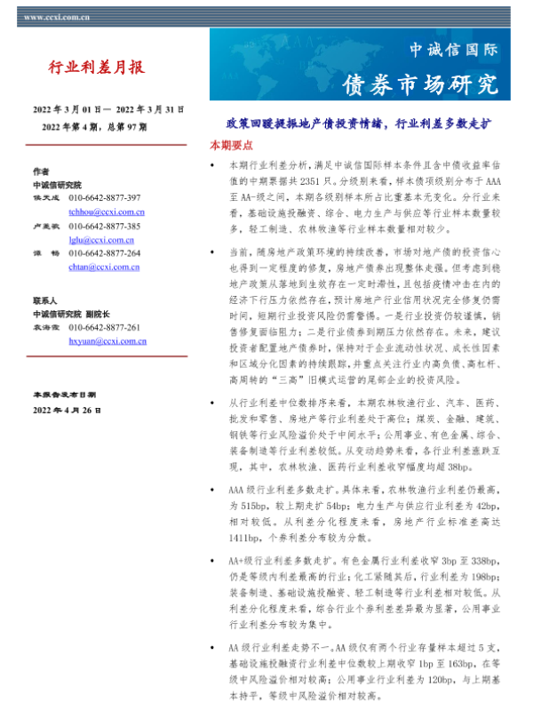 【中诚信国际】【20220426】中诚信-行业利差月报-政策回暖提振地产债投资情绪,行业利差多数走扩-2022年3月-14页