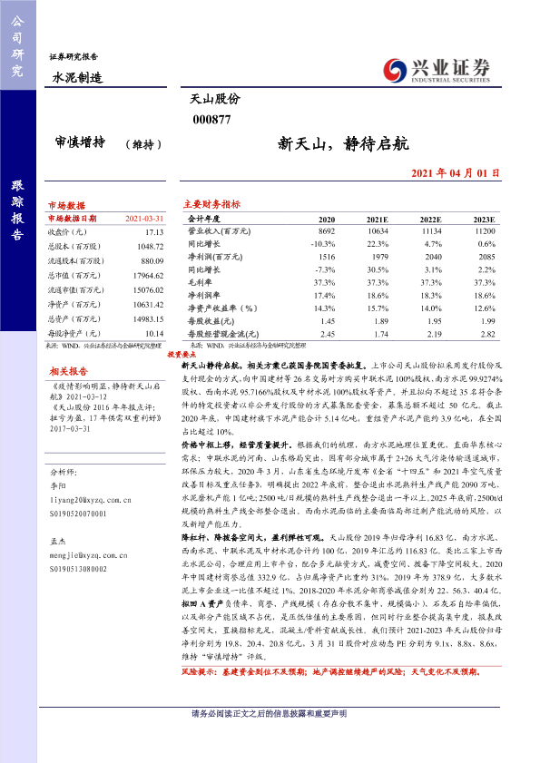 天山股份 市场展望 水泥制造 财务分析 资产重组
