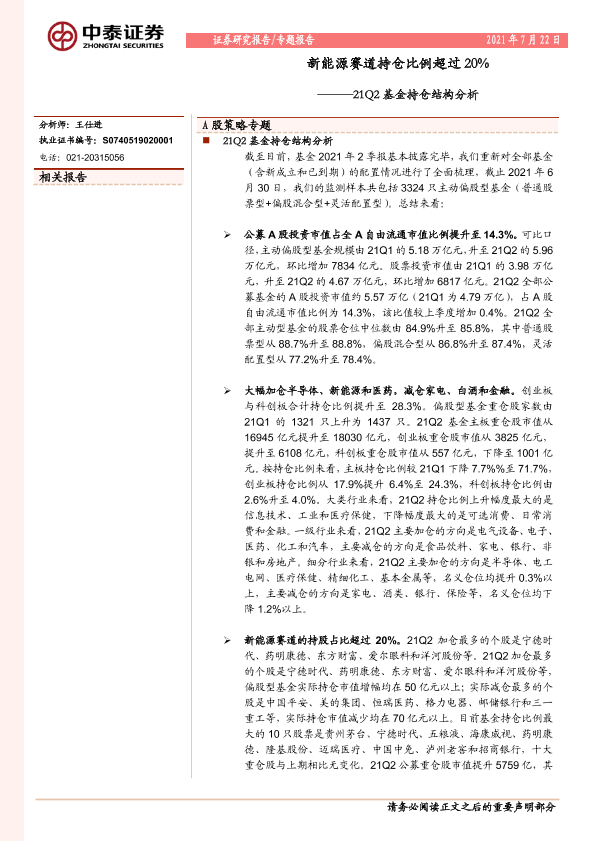 【中泰证券】【20210722】21Q2基金持仓结构分析:新能源赛道持仓比例超过20%-12页