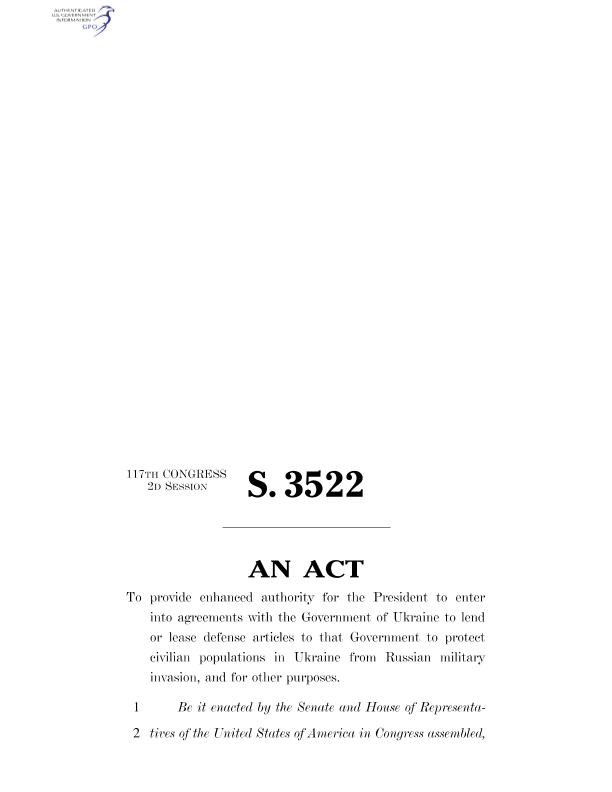 【United States Congress】【20220406】To provide enhanced authority for the President to enter into agreements with the Government of Ukraine to lend or lease defense articles-4页