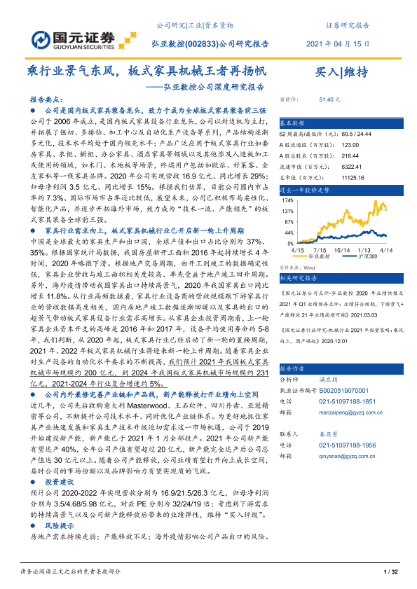 【国元证券】【20210415】弘亚数控公司深度研究报告:乘行业景气东风,板式家具机械王者再扬帆-32页