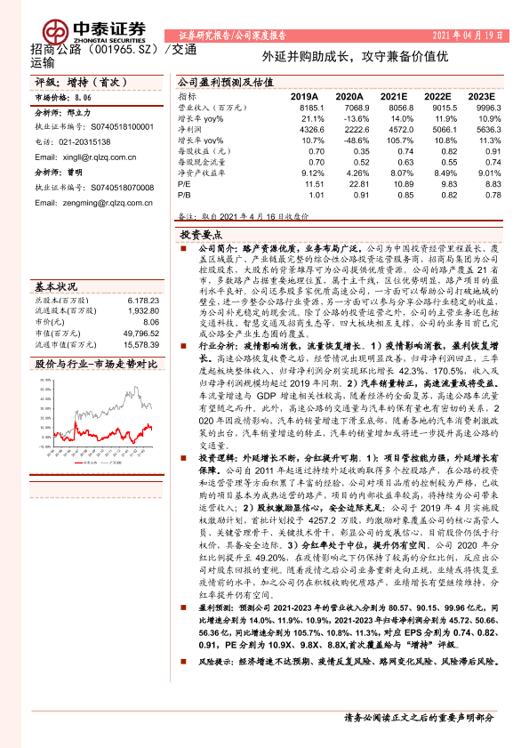 【中泰证券】【20210419】中泰证券-招商公路-001965.SZ-外延并购助成长,攻守兼备价值优-22页