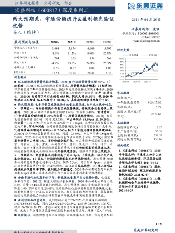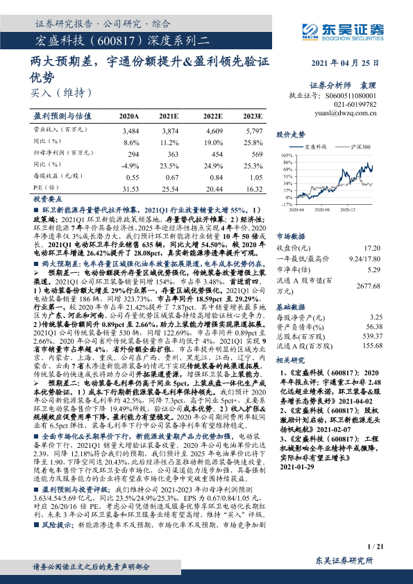 【东吴证券】【20210425】20210425-东吴证券-宏盛科技-600817.SH-深度系列二:两大预期差,宇通份额提升&盈利领先验证优势-21页