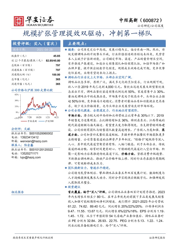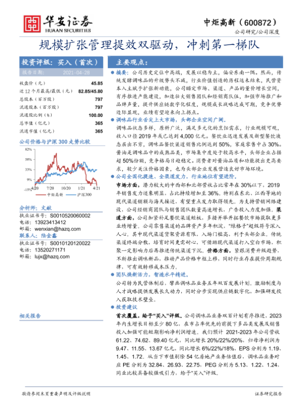业绩预测 中炬高新 管理提效 规模扩张 调味品行业