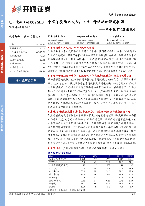 【开源证券】【20210504】巴比食品-605338.SH-中小盘首次覆盖报告:中式早餐面点龙头,内生+外延双轮驱动扩张-26页