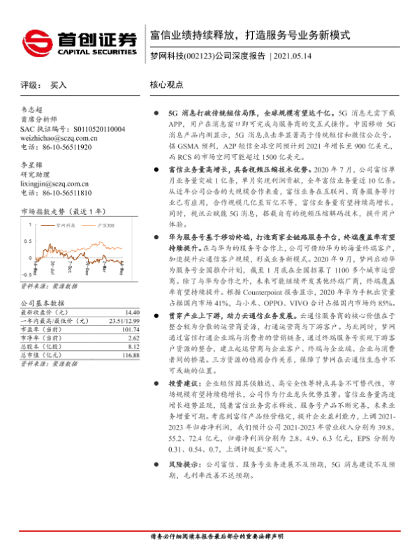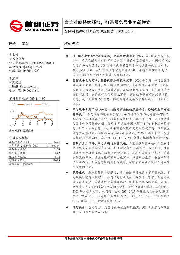 【首创证券】【20210514】20210514-首创证券-梦网科技-002123.SZ-公司深度报告:富信业绩持续释放,打造服务号业务新模式-27页