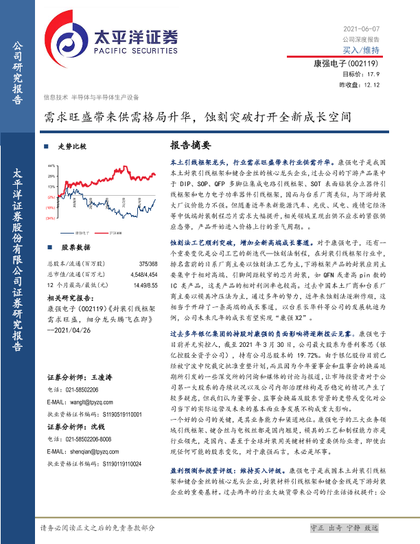 供需格局 半导体 康强电子 引线框架 蚀刻工艺