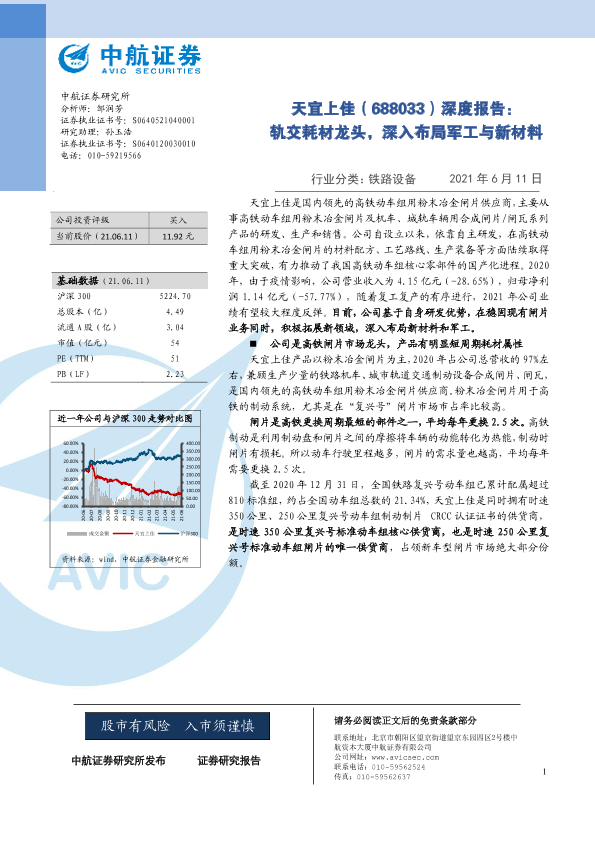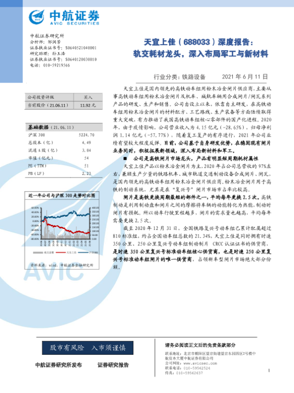 【中航证券】【20210611】天宜上佳深度报告:轨交耗材龙头,深入布局军工与新材料-30页