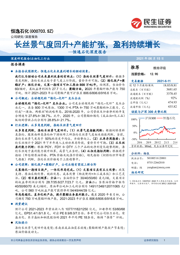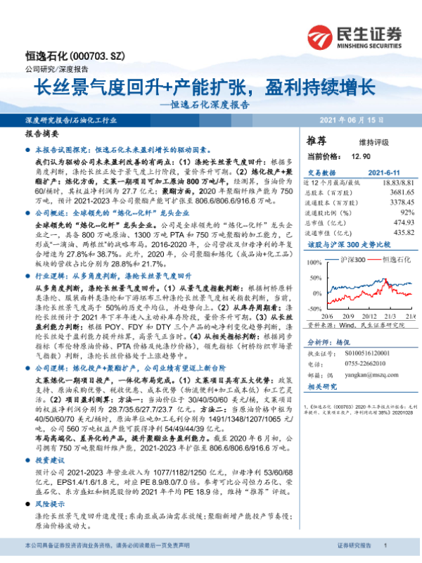 【民生证券】【20210615】恒逸石化深度报告:长丝景气度回升+产能扩张,盈利持续增长-32页