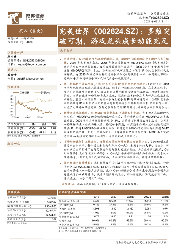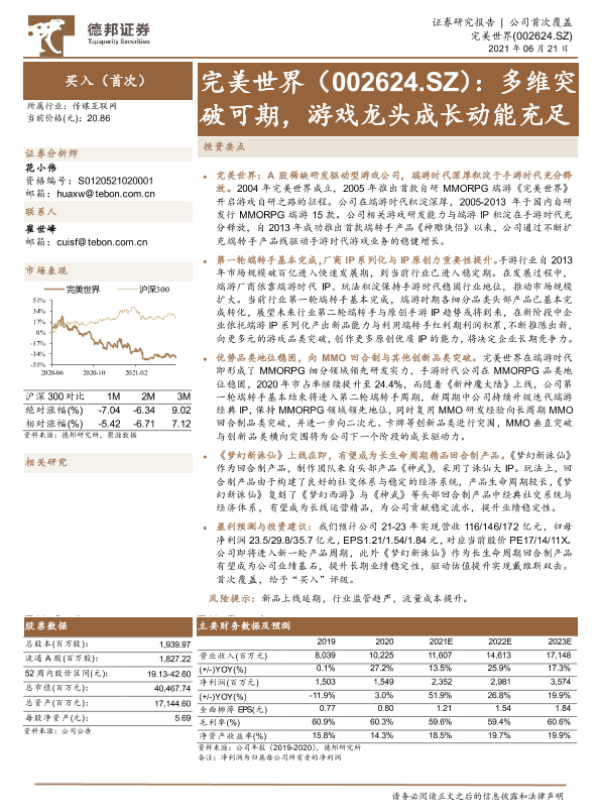 【德邦证券】【20210621】20210621-德邦证券-完美世界-002624.SZ-多维突破可期,游戏龙头成长动能充足-30页