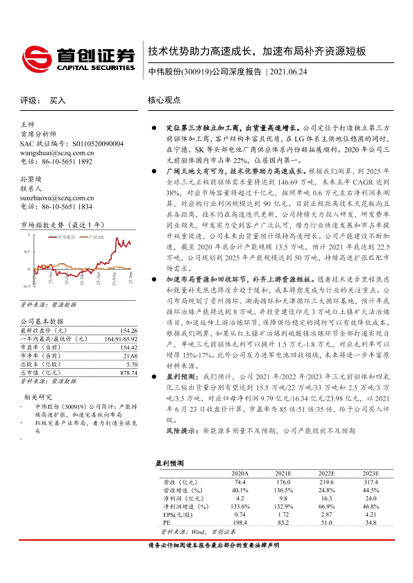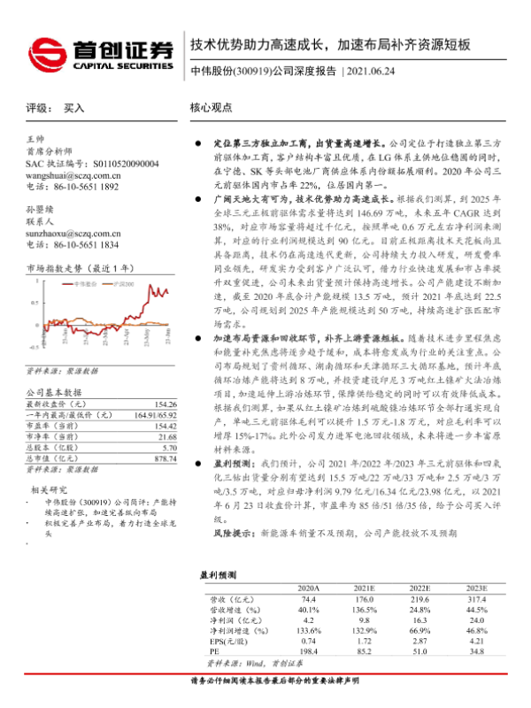 【首创证券】【20210624】中伟股份-公司深度报告:技术优势助力高速成长,加速布局补齐资源短板-25页
