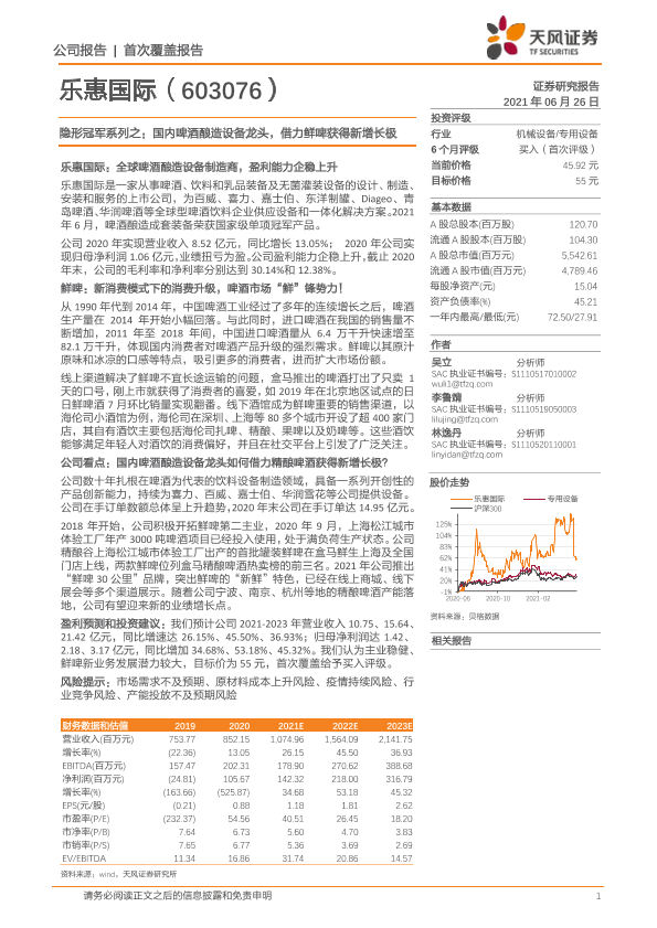 【天风证券】【20210626】隐形冠军系列之:国内啤酒酿造设备龙头,借力鲜啤获得新增长极-30页