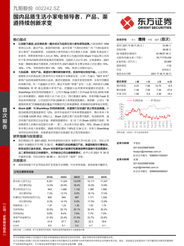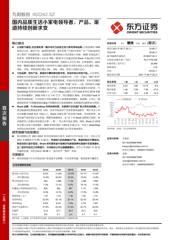 【东方证券】【20210628】九阳股份-国内品质生活小家电领导者,产品、渠道持续创新求变-33页