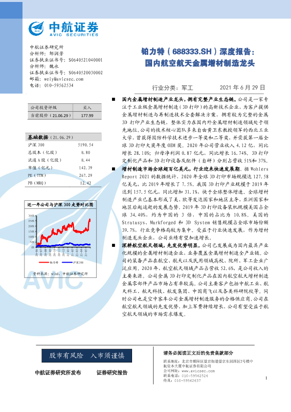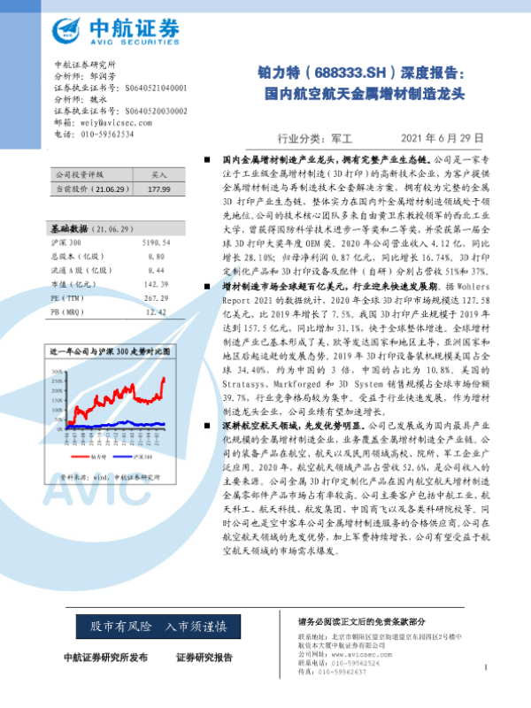 【中航证券】【20210629】铂力特-688333.SH-深度报告:国内航空航天金属增材制造龙头-32页