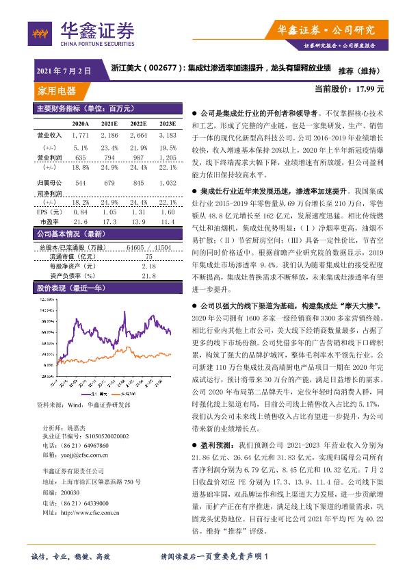 【华鑫证券】【20210702】浙江美大:集成灶渗透率加速提升,龙头有望释放业绩-18页