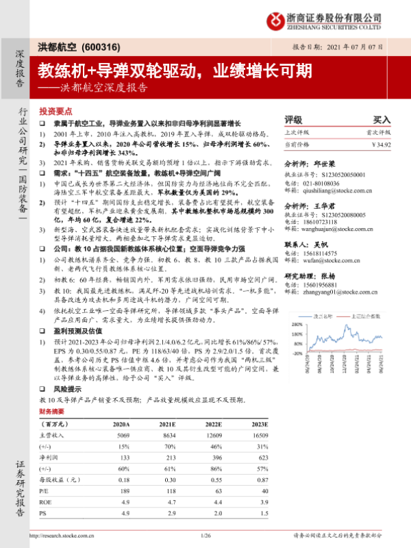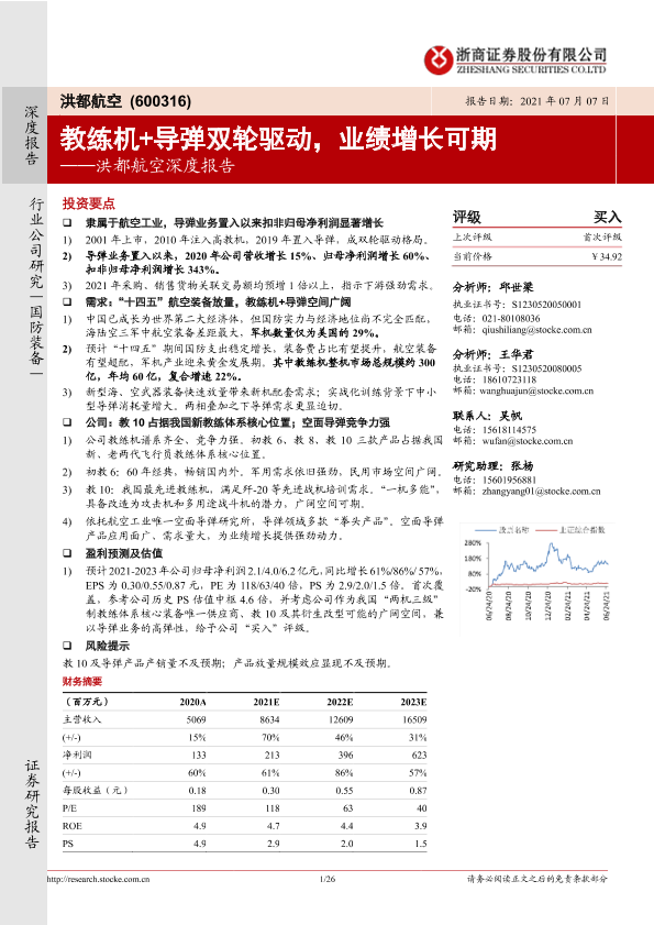 【浙商证券】【20210707】洪都航空深度报告:教练机+导弹双轮驱动,业绩增长可期-26页
