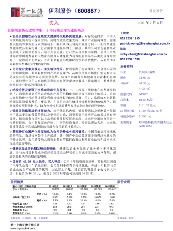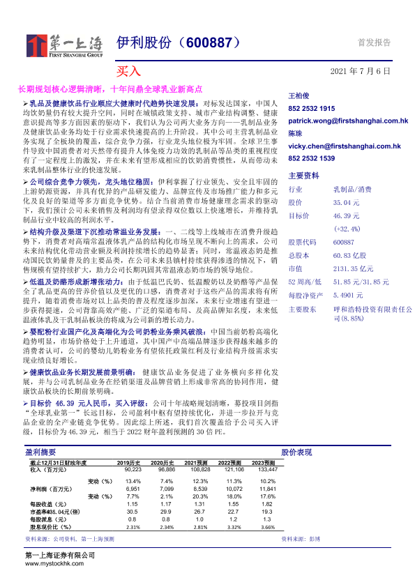 【第一上海证券】【20210706】伊利股份-长期规划核心逻辑清晰,十年问鼎全球乳业新高点-26页