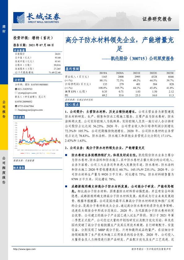 【长城证券】【20210708】凯伦股份-高分子防水材料领先企业,产能增量充足-20页