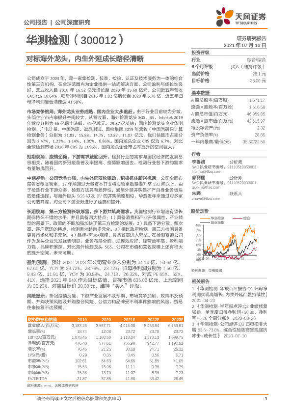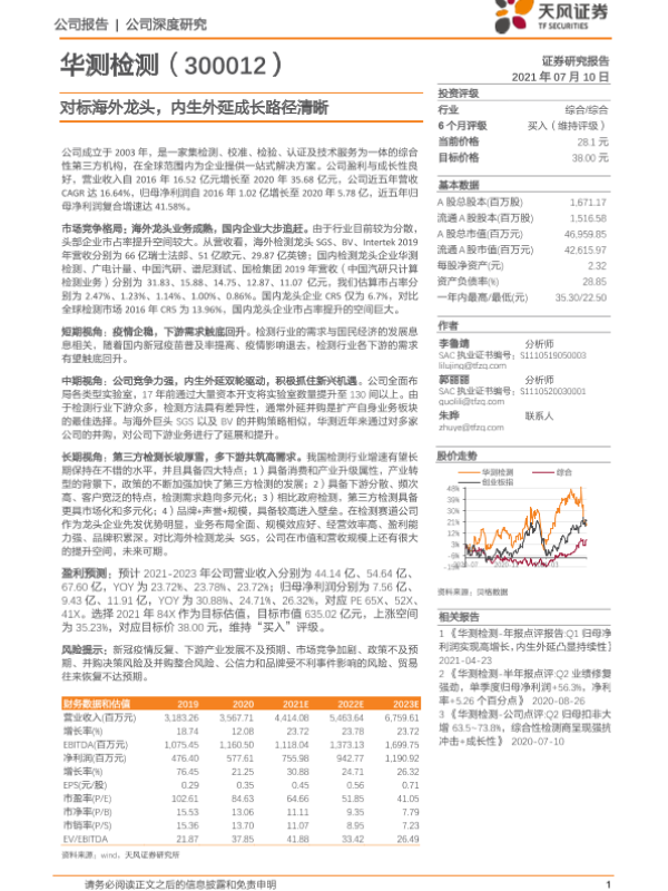 【天风证券】【20210710】华测检测-300012.SZ-对标海外龙头,内生外延成长路径清晰-33页