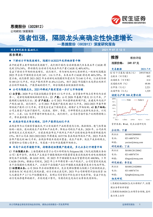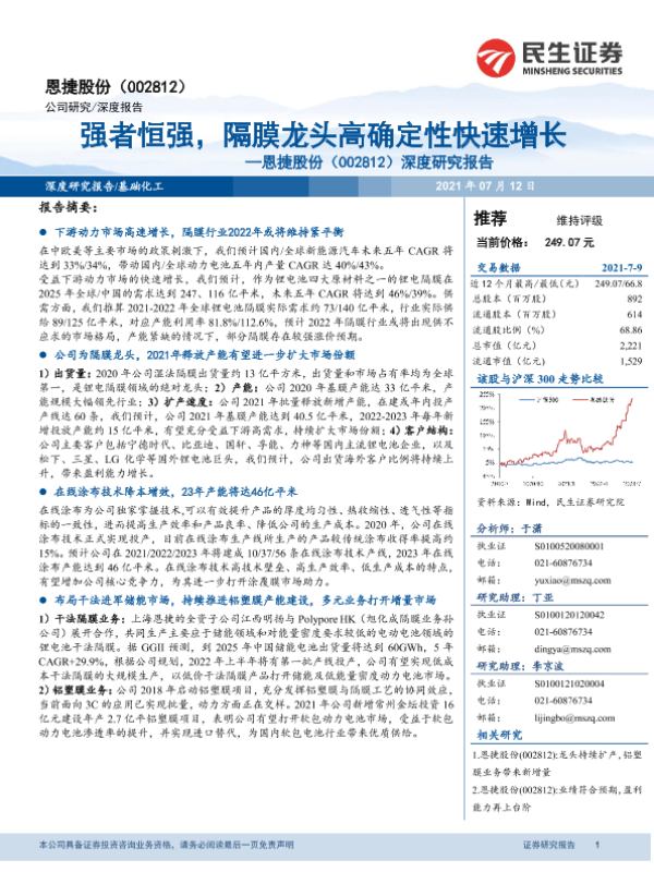 【民生证券】【20210712】强者恒强,隔膜龙头高确定性快速增长—恩捷股份(002812)深度研究报告-47页