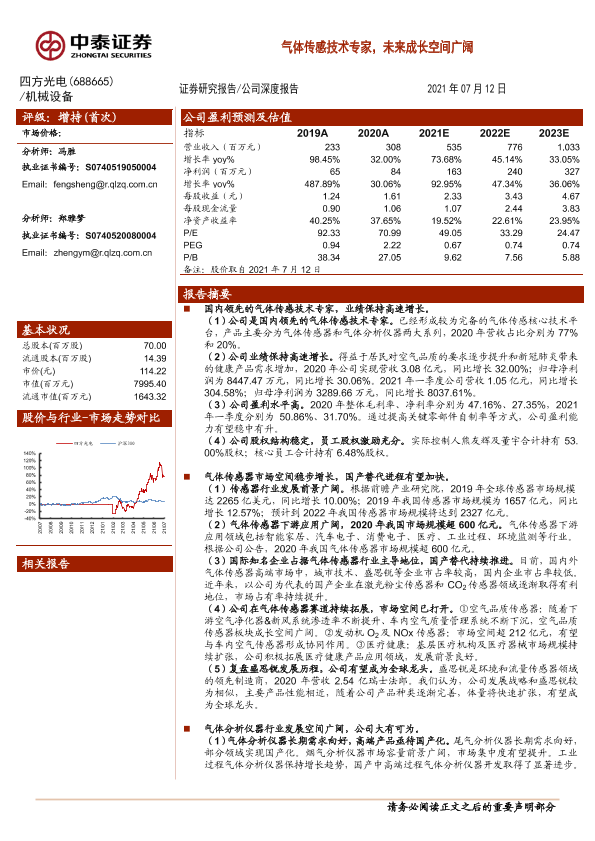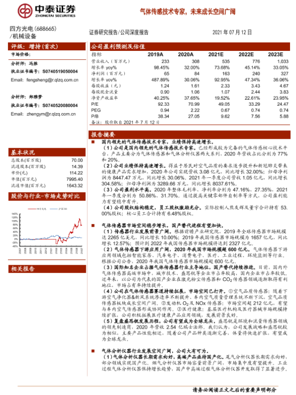 【中泰证券】【20210712】20210712-中泰证券-四方光电-688665.SH-气体传感技术专家,未来成长空间广阔-40页