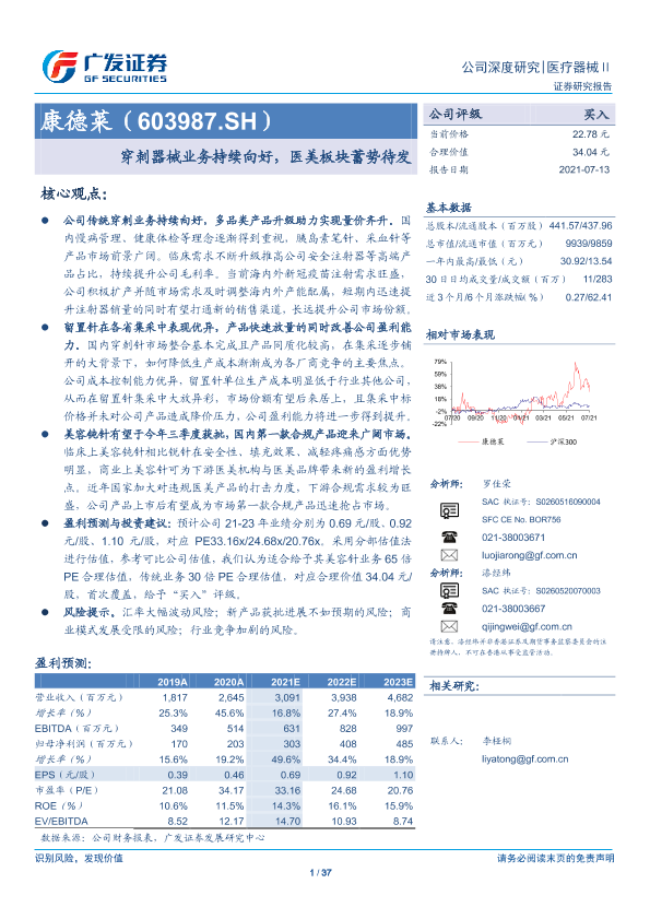 【广发证券】【20210713】康德莱-603987.SH-穿刺器械业务持续向好,医美板块蓄势待发-37页