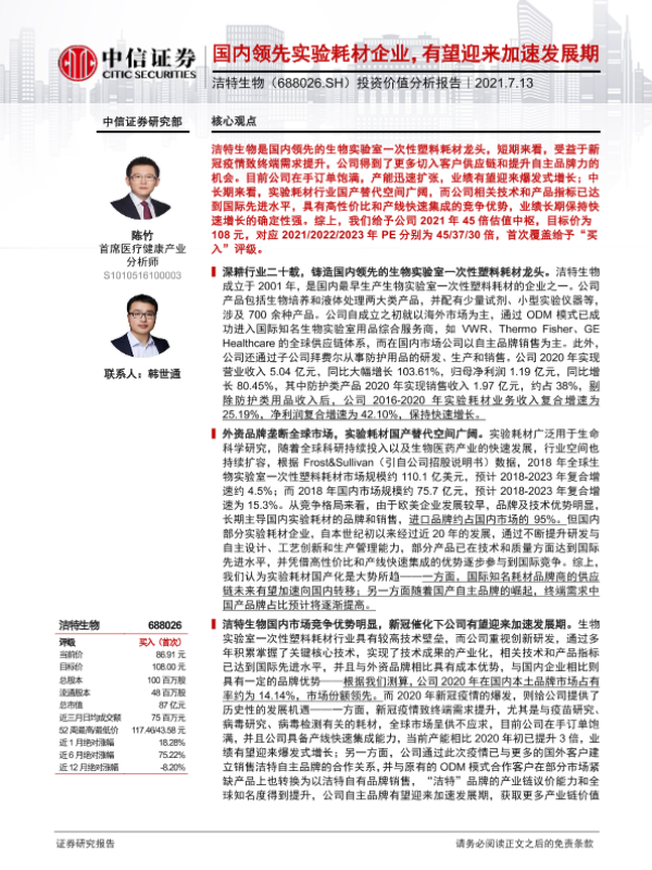 【中信证券】【20210713】20210713-中信证券-洁特生物-688026.SH-投资价值分析报告:国内领先实验耗材企业,有望迎来加速发展期-51页