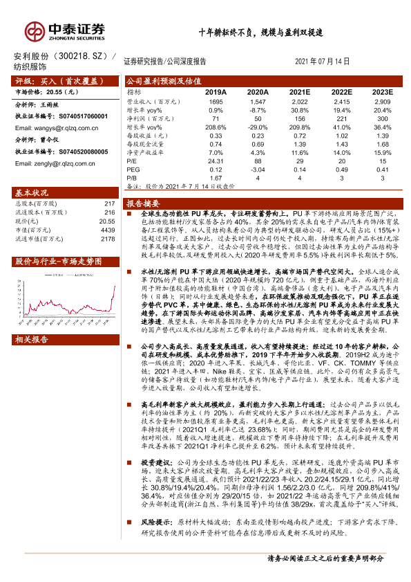 PU革 安利股份 生态功能性 研发投入 高端市场