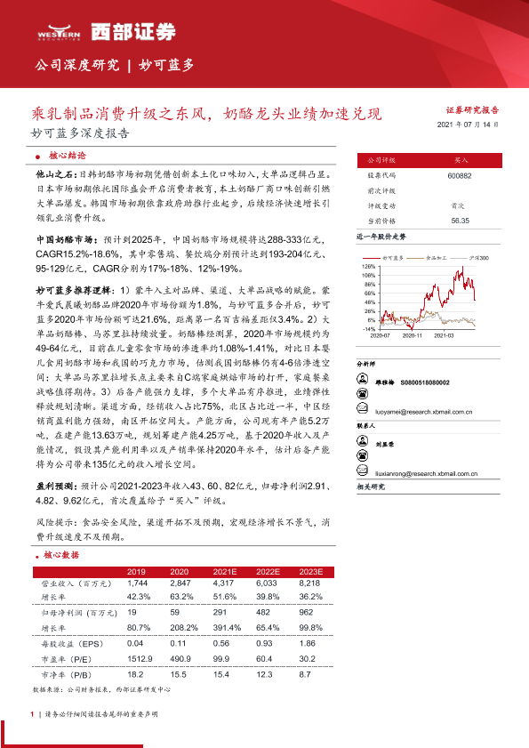 【西部证券】【20210714】妙可蓝多深度报告:乘乳制品消费升级之东风,奶酪龙头业绩加速兑现-64页