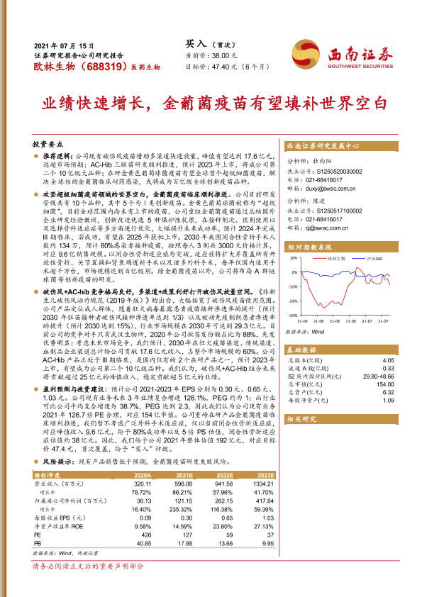 【西南证券】【20210715】20210715-西南证券-欧林生物-688319.SH-业绩快速增长,金葡菌疫苗有望填补世界空白-26页