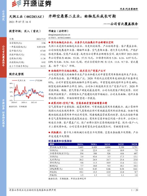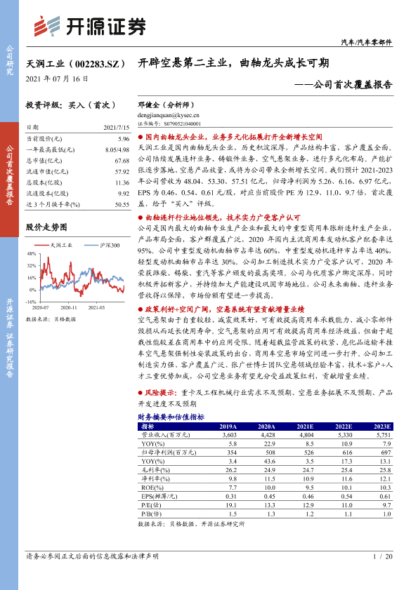 【开源证券】【20210716】天润工业-002283.SZ-公司首次覆盖报告:开辟空悬第二主业,曲轴龙头成长可期-20页