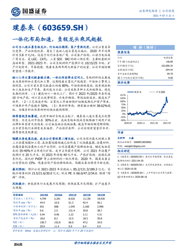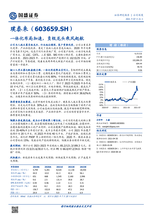 一体化布局 璞泰来 证券分析 负极材料 锂电池