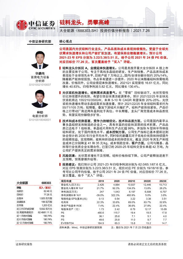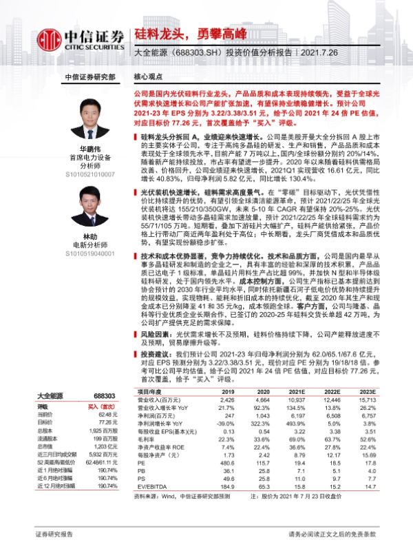 【中信证券】【20210726】20210726-中信证券-大全能源-688303.SH-投资价值分析报告:硅料龙头,勇攀高峰-28页