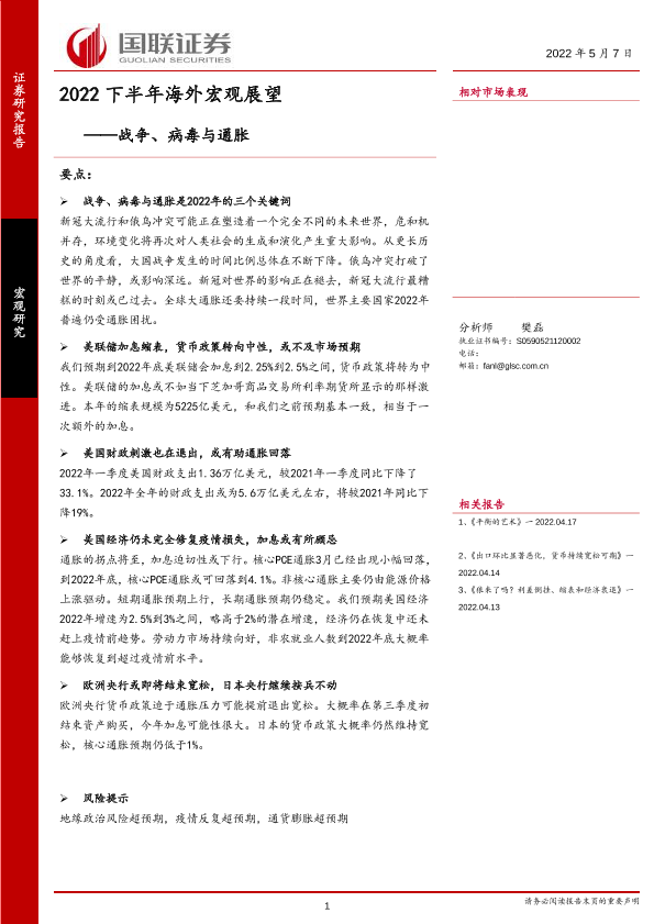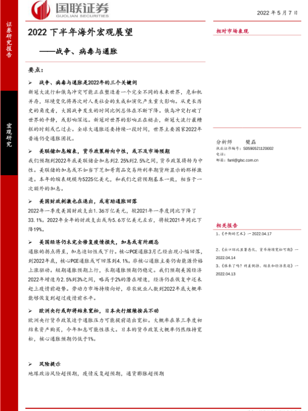 【国联证券】【20220507】2022下半年海外宏观展望:战争、病毒与通胀-20页