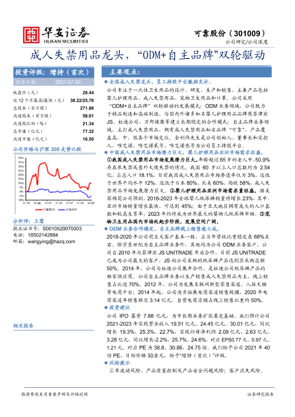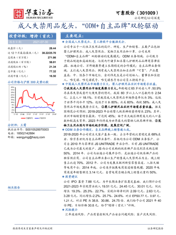 【华安证券】【20210730】可靠股份-301009.SZ-成人失禁用品龙头,“ODM+自主品牌”双轮驱动-27页