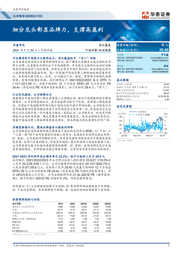 业绩预测 品牌溢价 高尔夫服饰 高端品牌 比音勒芬