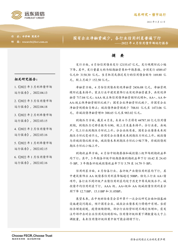 【远东资信】【20220512】2022年4月信用债市场运行报告:国有企业净融资减少,各行业信用利差普遍下行-19页