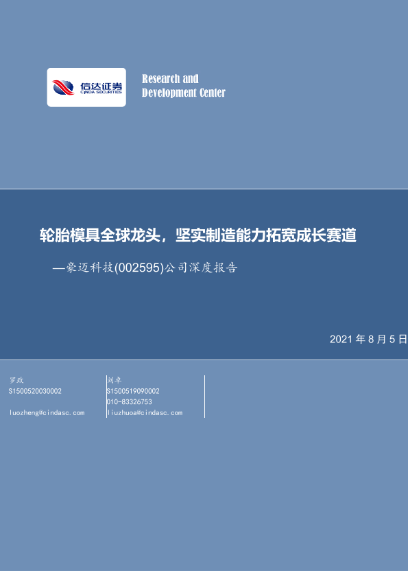 【信达证券】【20210805】20210805-信达证券-豪迈科技-002595.SZ-公司深度报告:轮胎模具全球龙头,坚实制造能力拓宽成长赛道-30页