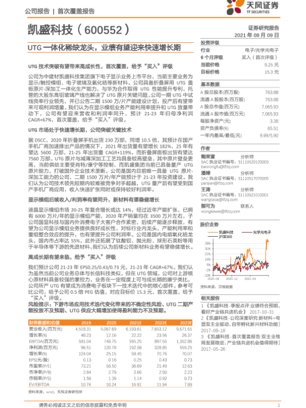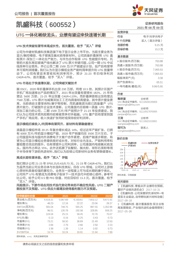 【天风证券】【20210809】凯盛科技-600552.SH-UTG一体化稀缺龙头,业绩有望迎来快速增长期-21页