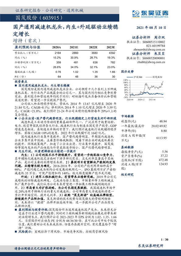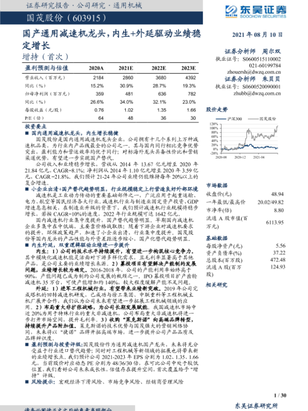 【东吴证券】【20210810】国茂股份-603915.SH-国产通用减速机龙头,内生+外延驱动业绩稳定增长-30页