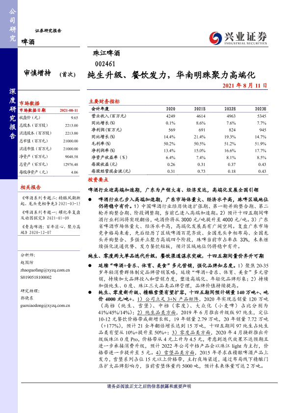啤酒行业 珠江啤酒 纯生升级 餐饮渠道 高端化