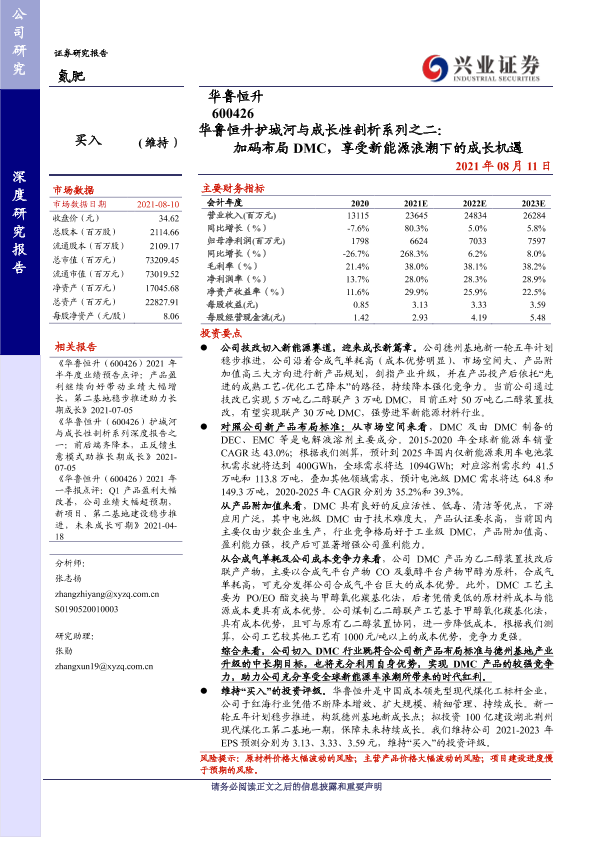 【兴业证券】【20210811】华鲁恒升护城河与成长性剖析系列之二:加码布局DMC,享受新能源浪潮下的成长机遇-27页