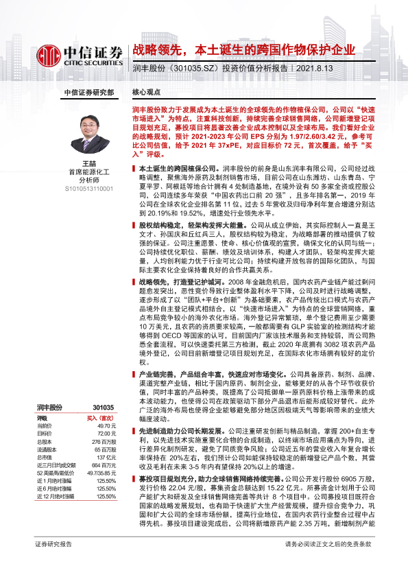【中信证券】【20210813】润丰股份(301035.SZ)投资价值分析报告:战略领先,本土诞生的跨国作物保护企业-32页