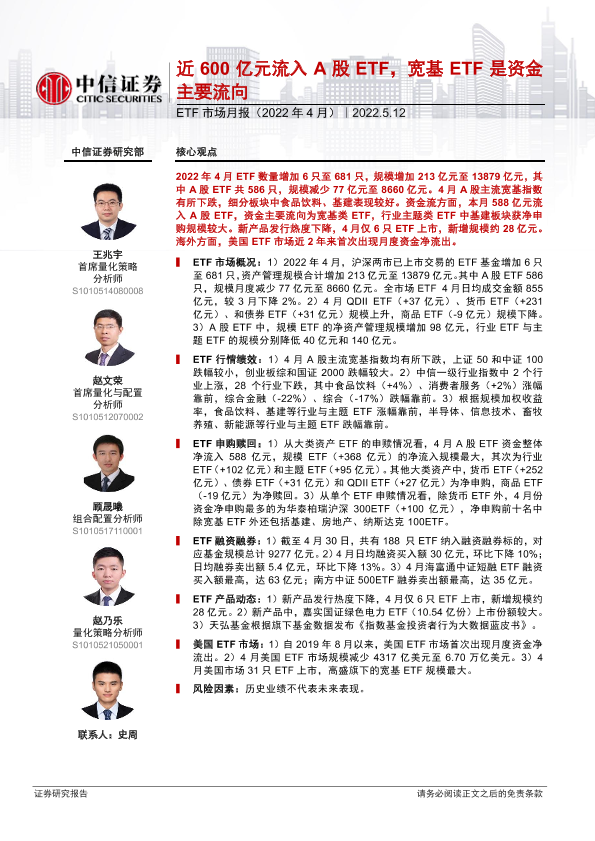 【中信证券】【20220512】ETF市场月报(2022年4月):近600亿元流入A股ETF,宽基ETF是资金主要流向-22页