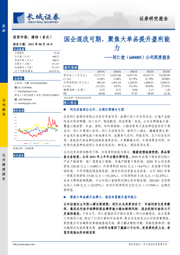 【长城证券】【20210818】20210818-长城证券-同仁堂-600085.SH-公司深度报告:国企混改可期、聚焦大单品提升盈利能力-23页