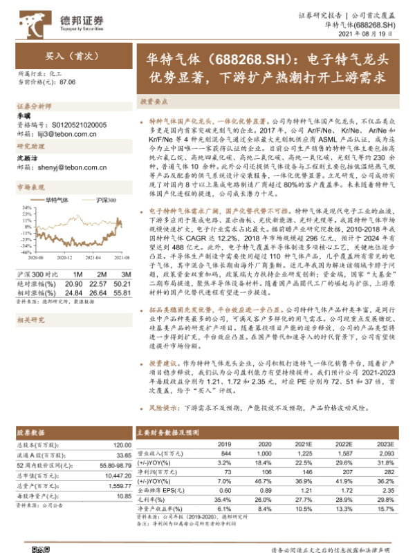 【德邦证券】【20210819】华特气体(688268.SH):电子特气龙头优势显著,下游扩产热潮打开上游需求-35页
